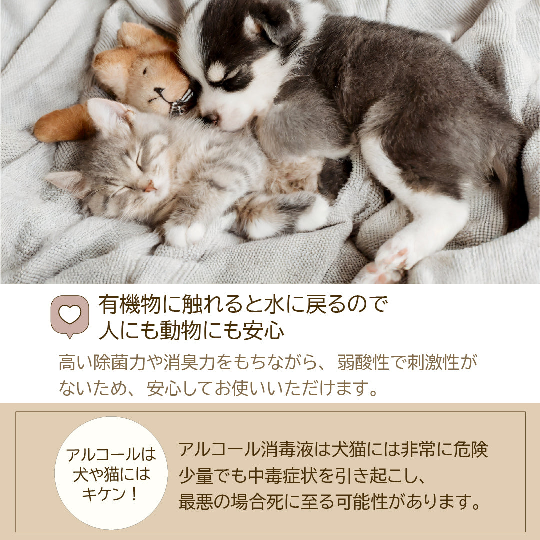 | ●内容量:アクアリブ原液1L(有効遊離塩素濃度400ppm) +スプレーボトル500cc(4倍希釈済みアクアリブ 有効遊離塩素濃度:100ppm) ●成分名:次亜塩素酸水溶液(原料:次亜塩素酸ナトリウム NaCLO/塩酸 HCL/水 H2O) ●液性:微酸性 (Ph5.5〜6.6) ■次亜塩素酸ナトリウムに希塩酸と水を特殊技術で混交させて作った微酸性次亜塩素酸水です。人の皮膚や動物の被毛、菌やウイルスなどの有機物に触れると真水に戻るので、赤ちゃんやペットが舐めても安心安全です。 ■次亜塩素酸水は、新型コロナウイルスに対する有効性が経産省(NITE)の検証試験で認められました。 ■アクアリブスプレーは希釈済です。希釈せずそのままお使いください。 ◆◆◆注意事項◆◆◆ ◆高温・直射日光を避けて冷暗所に保管して下さい。 ◆アクアリブは経時変化により濃度が薄くなります(400ppm 保証有効期限:冷暗所保管で約6ヶ月) ◆他のアルカリ性・酸性の製品とは混ぜないで下さい。 ◆金属が長時間アクアリブに暴露されると腐食する場合があります。アクアリブを吹きかけた場合は長時間放置せずに拭き取り、アクアリブ液中に金属を浸漬させないよう注意して下さい。 ◆ウイルス不活化や除菌目的で使用する場合は、対象物の汚れをあらかじめ取り除いてから使用して下さい。 ◆商品の価格及びデザイン・仕様は、改善のため予告なく変更する場合があります。 |