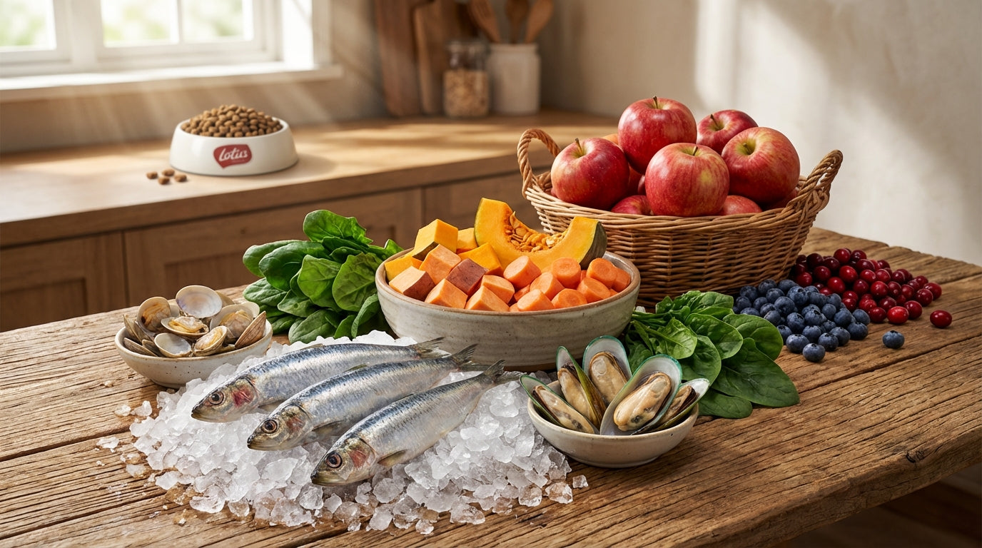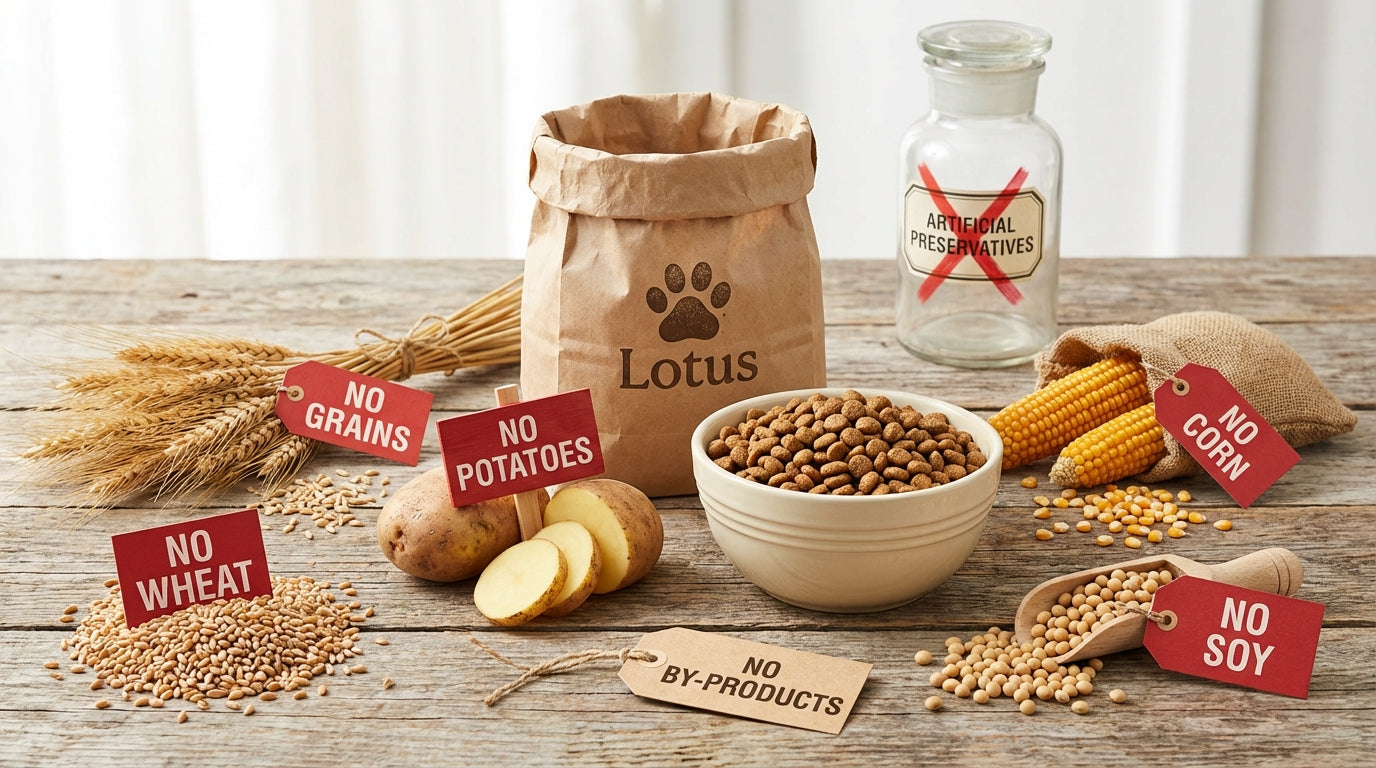 ロータスキャットフードは、新鮮な魚(イワシ、ニシン)や貝(ハマグリ、緑イ貝)、野菜(かぼちゃ、さつまいも、人参、ほうれん草)や果物(りんご、ブルーベリー、クランベリー)等、人間用の食材と同じレベルの原材料から作られています。