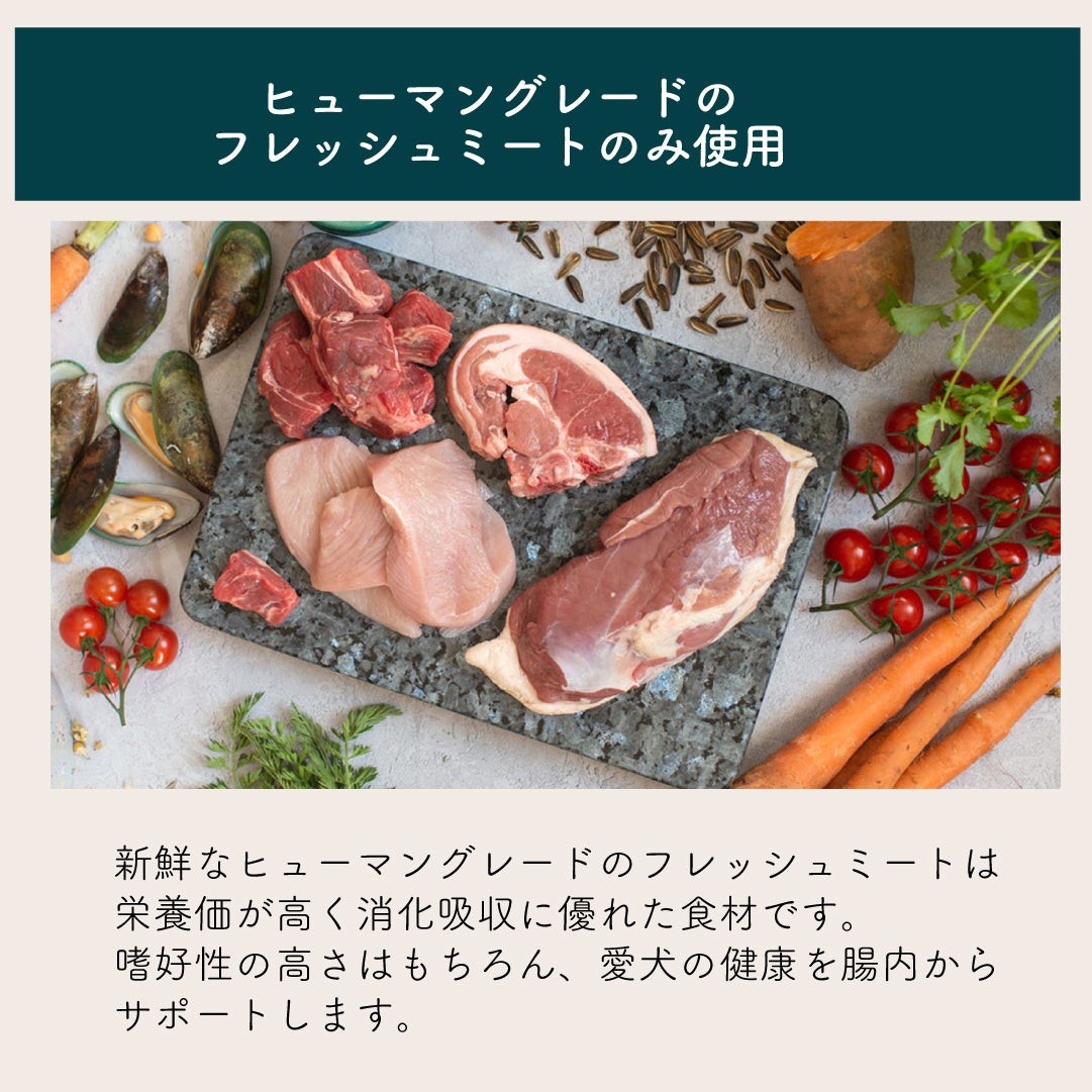 フレッシュターキー 35%、スイートポテト 35%、加水分解タラ 10%、全卵 7%、ビートファイバー 4.307%、リグノスルフォン酸塩 2.2%、ビール酵母 2.05%、サーモンオイル 0.6%、サンフラワーオイル 0.6%、イヌリン 0.5%、ハーブブレンド 0.25%(パセリ、ローズマリー、イラクサ、カモミール、セージ、タイム、コリアンダーの葉、タンポポの葉、カンゾウ)、グルコサミン 0.098%、緑イ貝 0.05%、コンドロイチン硫酸 0.045%