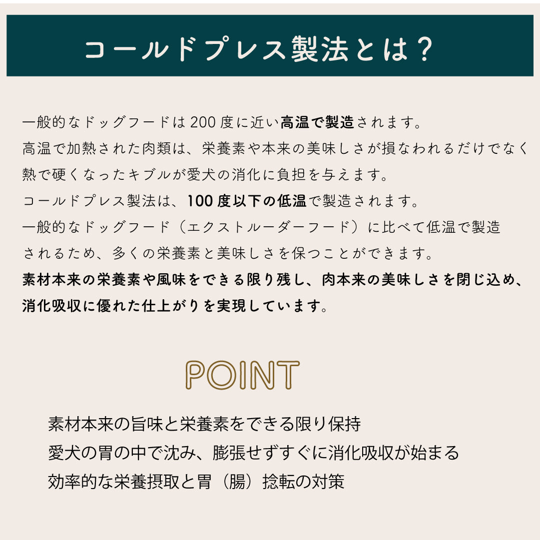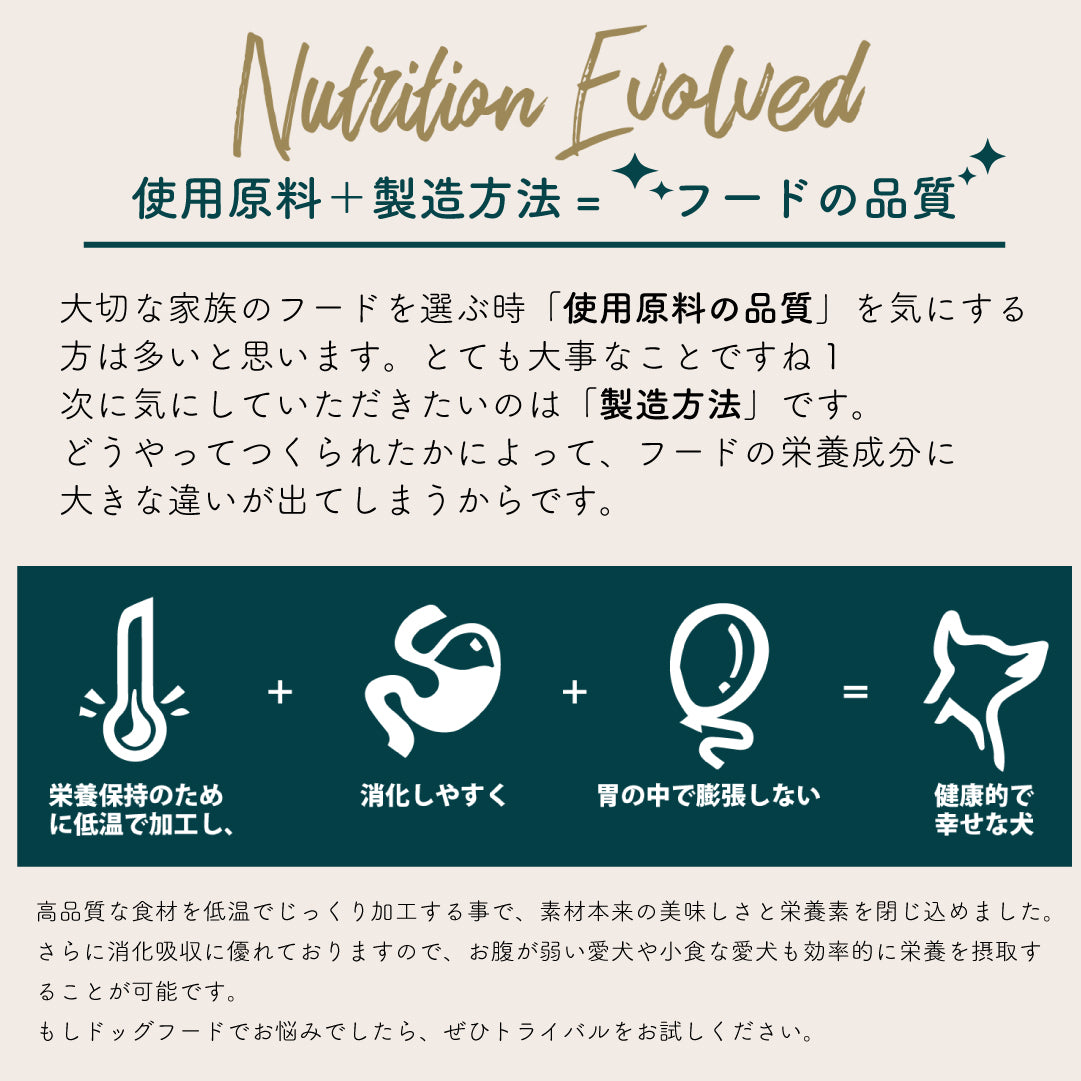 | 高品質な原料+低温製法=愛犬を幸せにするフード |