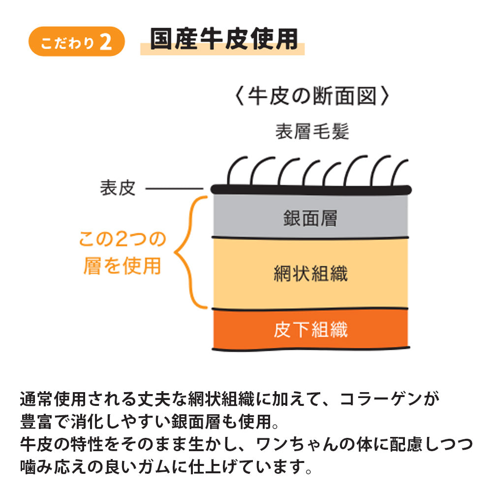 牛皮の特性をそのまま生かし、ワンちゃんの体に配慮しつつ噛み応えの良いガムに仕上げています。