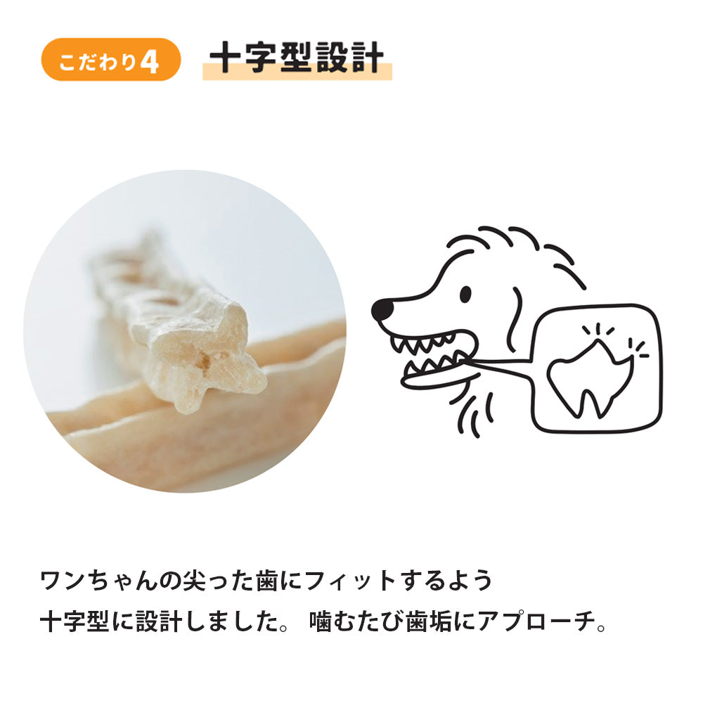 ワンちゃんの尖った歯にフィットするよう十字型に設計しました。 噛むたび歯垢にアプローチ。