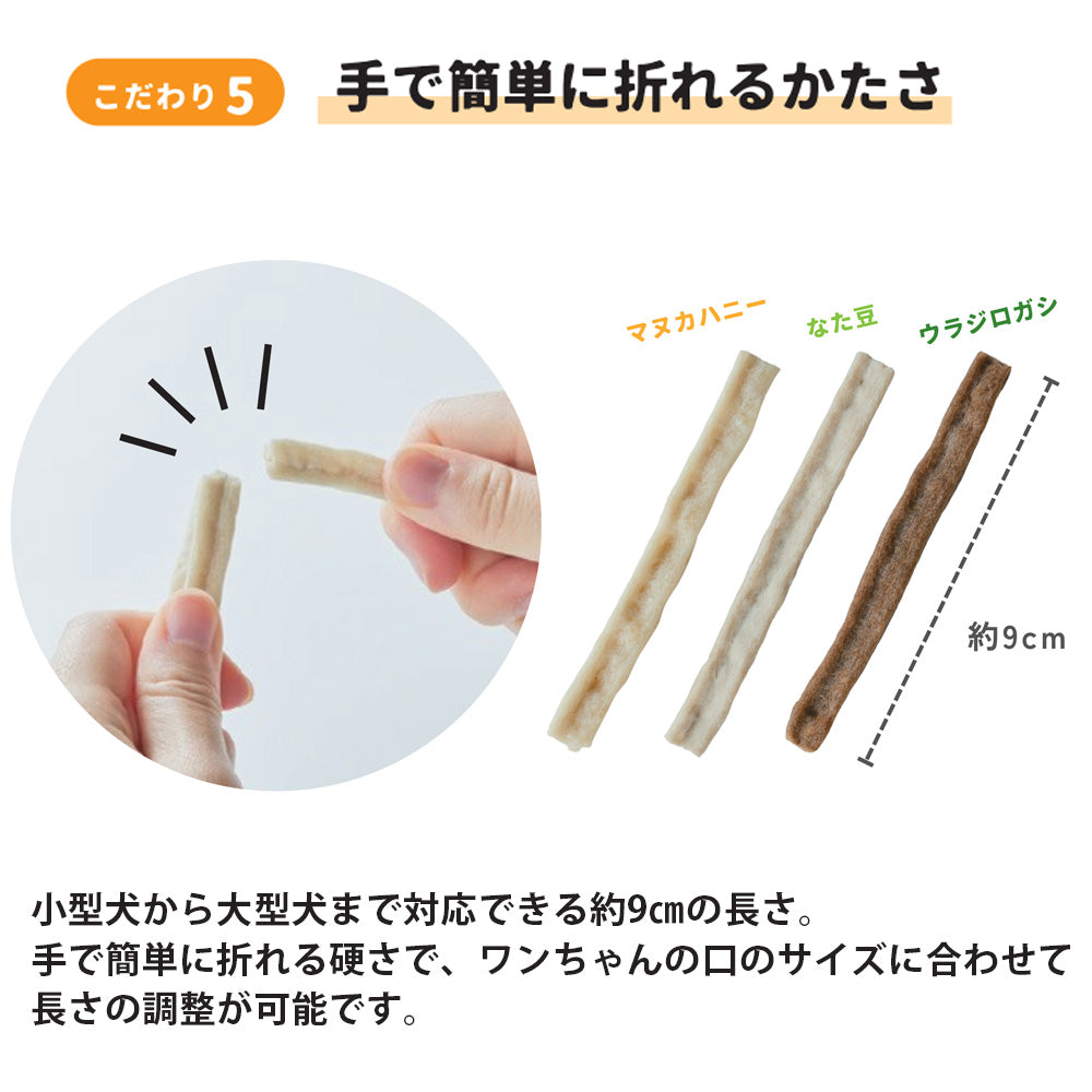 手で簡単に折れる硬さで、ワンちゃんの口のサイズに合わせて長さの調整が可能です。