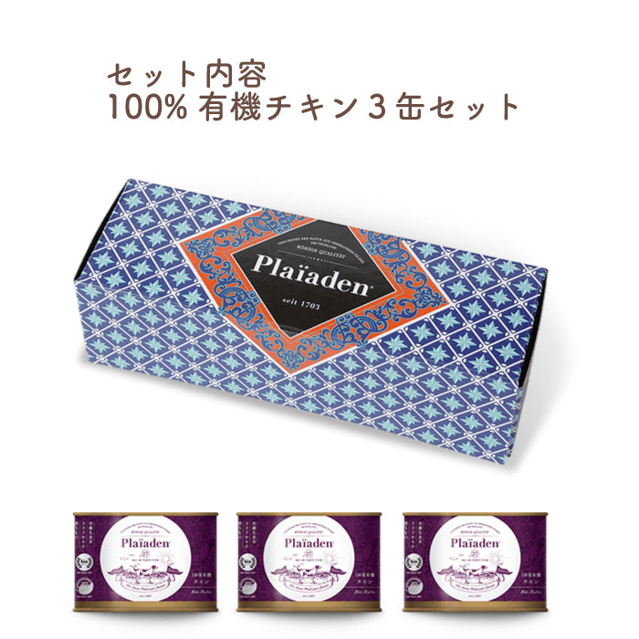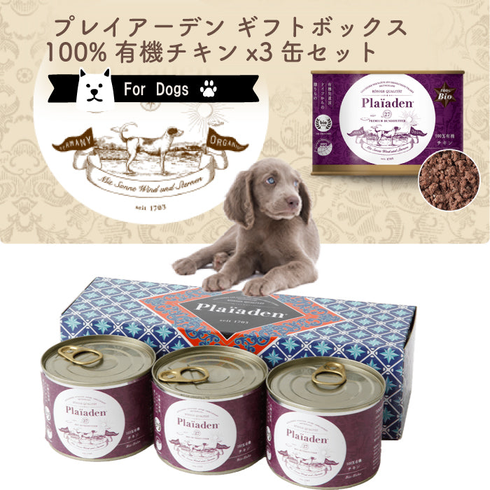 プレイアーデン[犬用] 100%有機 チキン 200gx3缶詰め合わせギフトセット オーガニック ドッグフード ウエット グレインフリー 無添加 缶詰 水分補給 ヒューマングレード ドイツ産 総合栄養食 食物アレルギー 消化器 腎臓 【賞味期限:2027年3月19日】