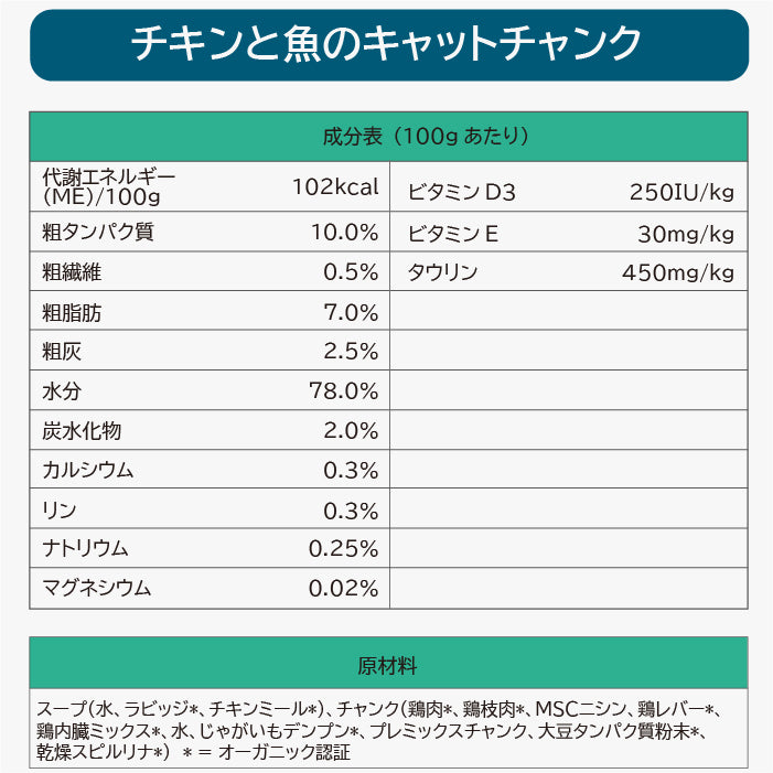 ※グレインフリーの総合栄養食なので、子猫の離乳食にも最適です。 ヤラーのチキンと魚のキャットチャンクは、自然の風を浴びた屋外でのびのび育ったオーガニックチキンとMSC認証のお魚が原料です。 肉食獣の性質を色濃く残すねこちゃんたちには、良質のタンパク質が欠かせません。 体を健康に保つには、タンパク質の「質」が何より大事です。 チキンと魚のキャットチャンクに使われるオーガニックチキンは、ブロイラーの73倍の広さを占有し、自由に動き回って生活しています。余分な脂肪が少なく健康的なチキンになります。 オーガニック認証の原材料で作られたヤラーのウエットフードなら、"可愛いウチの子"にも安心して食べさせてあげられますね。 オーガニック認証機関が保証した高品質。オーガニックの底力を愛猫に! |