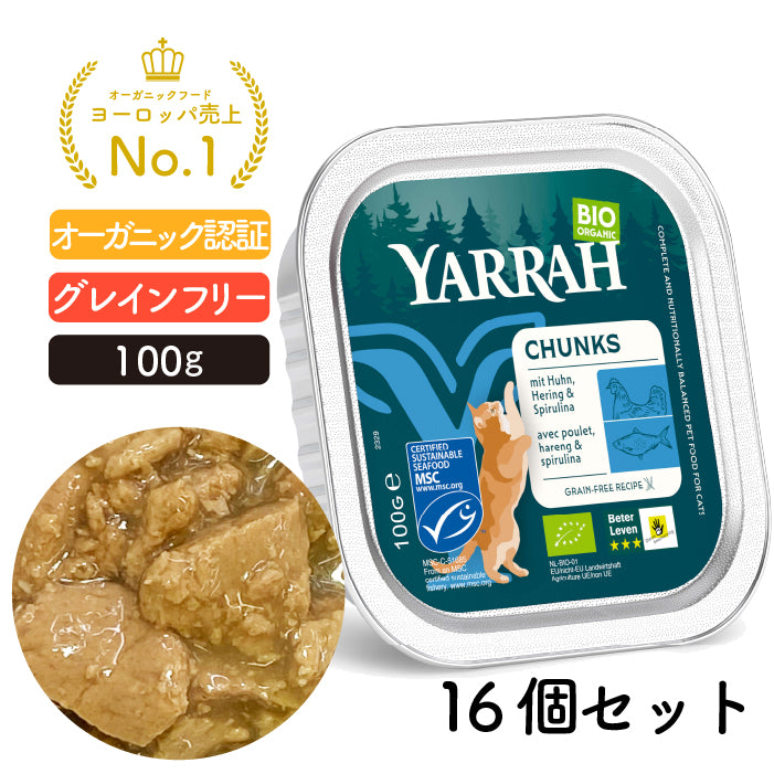 【5%オフ】ヤラー チキンと魚のキャットチャンク 100G アルミトレイ16個セット (同一種類16個入り) YARRAH オーガニック 総合栄養食【賞味期限2026年7月9日】