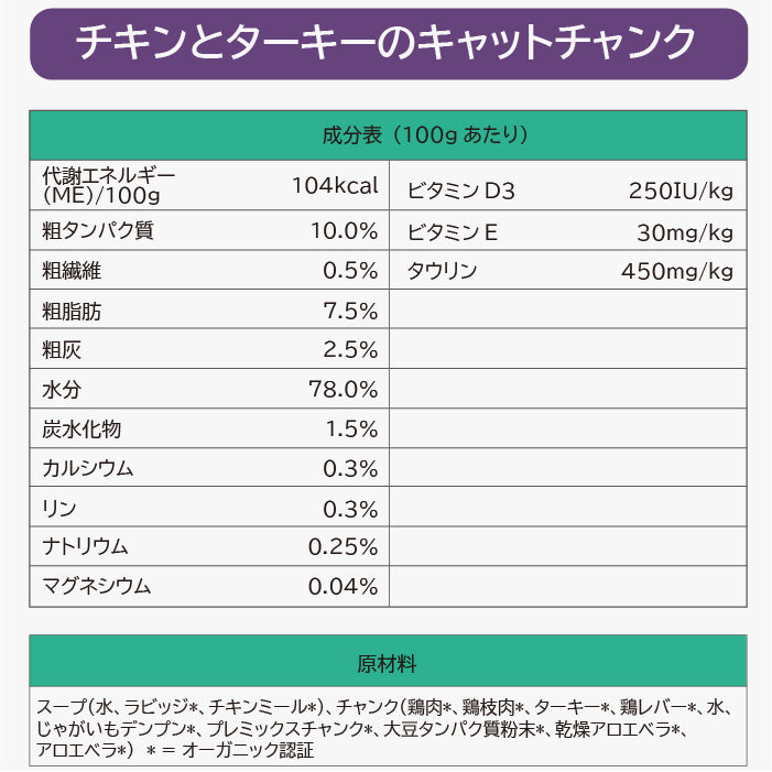 ※グレインフリーの総合栄養食なので、子猫の離乳食にも最適です。 ヤラーのチキンとターキーのキャットチャンクは、自然の風を浴びた屋外でのびのび育ったオーガニックチキンとオーガニックターキーが原料です。 肉食獣の性質を色濃く残すねこちゃんたちには、良質のタンパク質が欠かせません。 体を健康に保つには、タンパク質の「質」が何より大事です。 チキンとターキーのキャットチャンクに使われるオーガニックチキンもオーガニックターキーも、ブロイラーの73倍の広さを占有し、自由に動き回って生活しています。余分な脂肪が少なく健康的なお肉になります。 オーガニック認証の原材料で作られたヤラーのウエットフードなら、"可愛いウチの子"にも安心して食べさせてあげられますね。 オーガニック認証機関が保証した高品質。オーガニックの底力を愛猫に! |