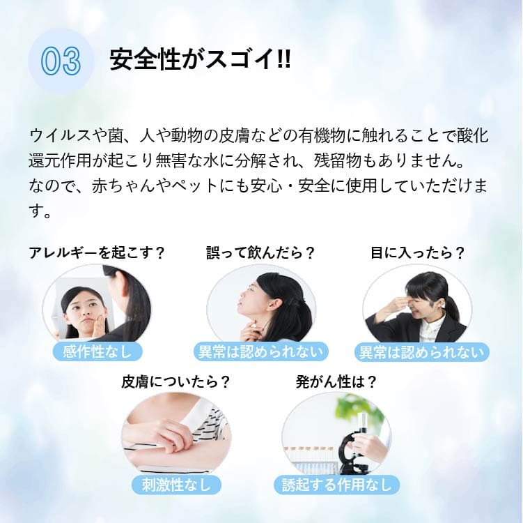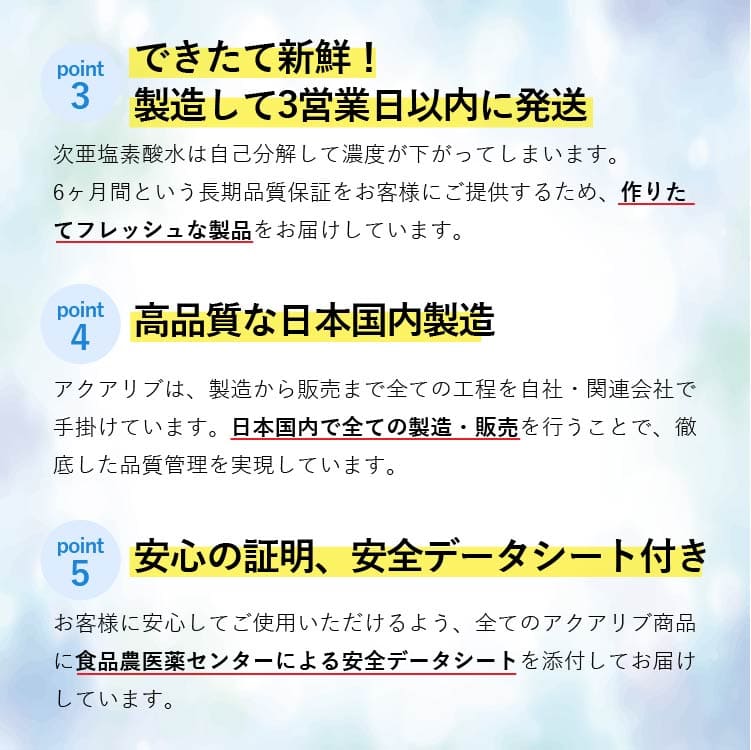 | ●内容量:スプレーボトル500cc(4倍希釈済みアクアリブ 有効遊離塩素濃度:100ppm) ●成分名:次亜塩素酸水溶液(原料:次亜塩素酸ナトリウム NaCLO/塩酸 HCL/水 H2O) ●液性:微酸性 (Ph5.5〜6.6) ■次亜塩素酸ナトリウムに希塩酸と水を特殊技術で混交させて作った微酸性次亜塩素酸水です。Ph調整をすることで安全性を確保しています。 ■次亜塩素酸水は、新型コロナウイルスに対する有効性が経産省(NITE)の検証試験で認められました。 ■アクアリブ原液は高濃度の400ppm。希釈して使えるからお得です。 ■タフテナーでお届けする大容量の10L、20Lは、外箱のダンボールに送付状を直接添付してお届け致します。 中に注水コックを封入していますので、蓋をコックに付け替えて箱のままお使いください。 容器を使いやすい場所に横向きに置いていただくと、コックをひねるだけでアクアリブを注ぐことができます。 ◆◆◆注意事項◆◆◆ ◆高温・直射日光を避けて冷暗所に保管して下さい。 ◆アクアリブ原液は使用時に目的にあわせて 水道水で希釈して下さい。 噴霧器に使用の際は原液を約8〜10倍に希釈 スプレーボトル用に希釈する場合は約4〜5倍でお使い下さい。 ◆アクアリブは経時変化により濃度が薄くなります(400ppm 保証有効期限:冷暗所保管で約6ヶ月) ◆他のアルカリ性・酸性の製品とは混ぜないで下さい。 ◆金属が長時間アクアリブに暴露されると腐食する場合があります。アクアリブを吹きかけた場合は長時間放置せずに拭き取り、アクアリブ液中に金属を浸漬させないよう注意して下さい。 ◆ウイルス不活化や除菌目的で使用する場合は、対象物の汚れをあらかじめ取り除いてから使用して下さい。 ◆商品の価格及びデザイン・仕様は、改善のため予告なく変更する場合があります。 |