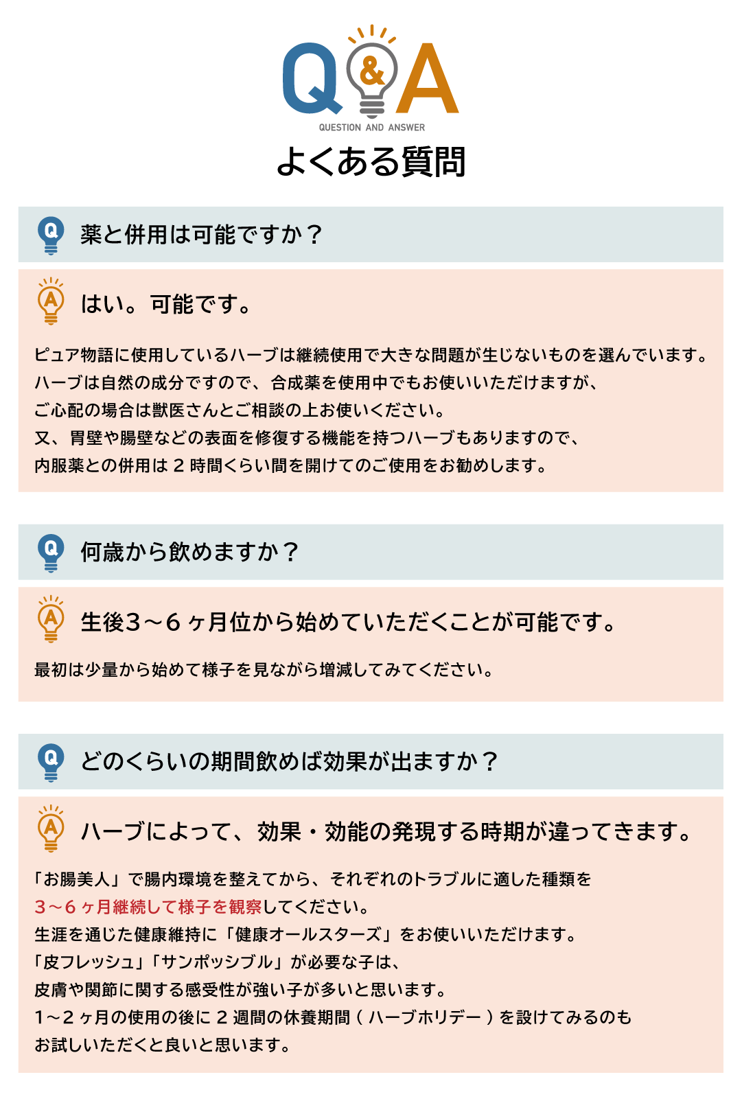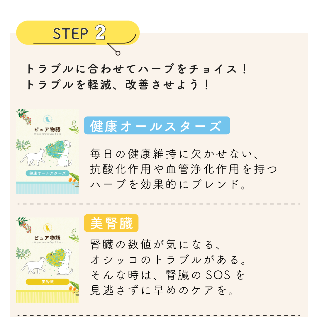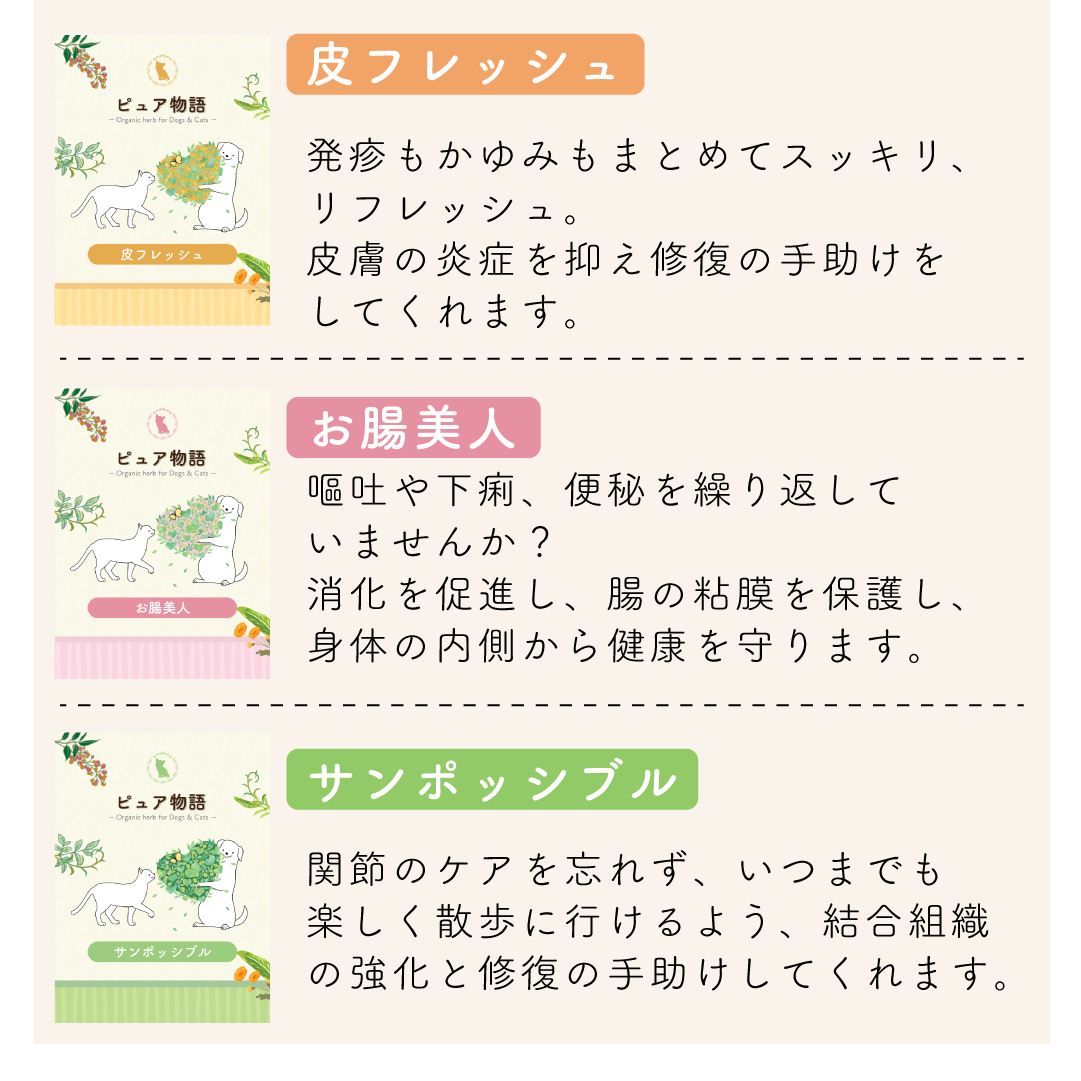 人間の食品用ハーブを使用しています。大切な家族には人間と同じ品質の物を与えたいという私達の想いを込めたブレンドです。