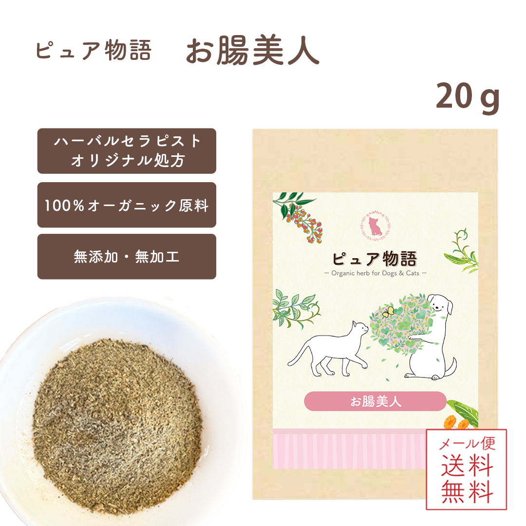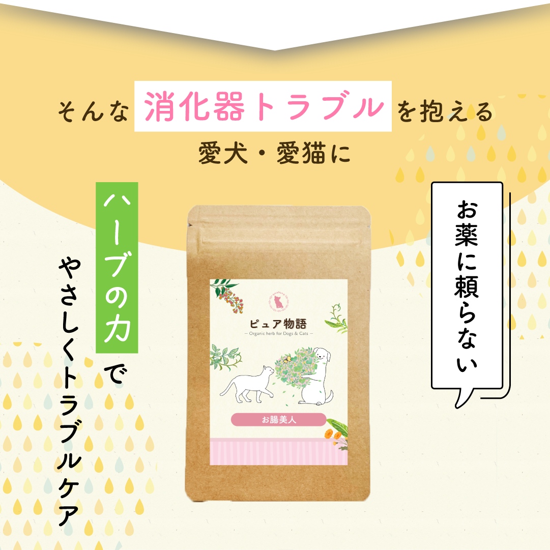 チワワのピュアのために、最初のハーブを処方した時、その効き目に実は自分でも驚きました。 即効性はない、穏やかに効果が出るはずなのに、抗生物質で荒れ果てたピュアのお腹は、優しいハーブのナチュラルな成分がよほど嬉しかったのでしょう。 それは、悪玉菌に戦いを挑んで排除しようとするパワーではなく、ピュアと一体化して優しく背中を押して応援してくれる、寄り添うパワーだったのだと思います。 西洋医学の世界では、診断名をつけて病気と戦います。 でも、病気も病変した体の細胞も(それはがん細胞であっても)実は自分の一部なのです。 なぜ人は、バランスを崩した自分の一部に戦いを挑んでしまうのでしょうね。 そんなことをハーブを摂り入れたピュアの体は教えてくれました。 ピュア物語/お腸美人は、消化器の健康維持を目的としたペットのためのオーガニックハーブのブレンドです。 特に胃腸の健康に役立つハーブをブレンドしました。 消化器のトラブルは、実は皮膚のトラブルなどとも密接な関連があります。 腸内環境を適正に保つことが健康の第一条件なんです。 生物が発生した当初、生き物は腸だけの存在でした。 腸は脳より賢いという人もいるくらいです。 腸内環境が整えば、他のトラブルもおのずと解決の道を辿ると言えるってことですね。 ピュア物語は、ハーブの単一成分を取り出すのではなく、ハーブそのものをWhle Foodととらえて作っています。 丸ごとのハーブ全体を摂取することによって、ハーブに含まれる様々な成分が相乗効果を発揮し、1+1が2以上のパワーになります。 合成薬のように即効性はありませんが、毎日摂取することにより健康な腸内環境と総合的な免疫力アップを助けます。 |