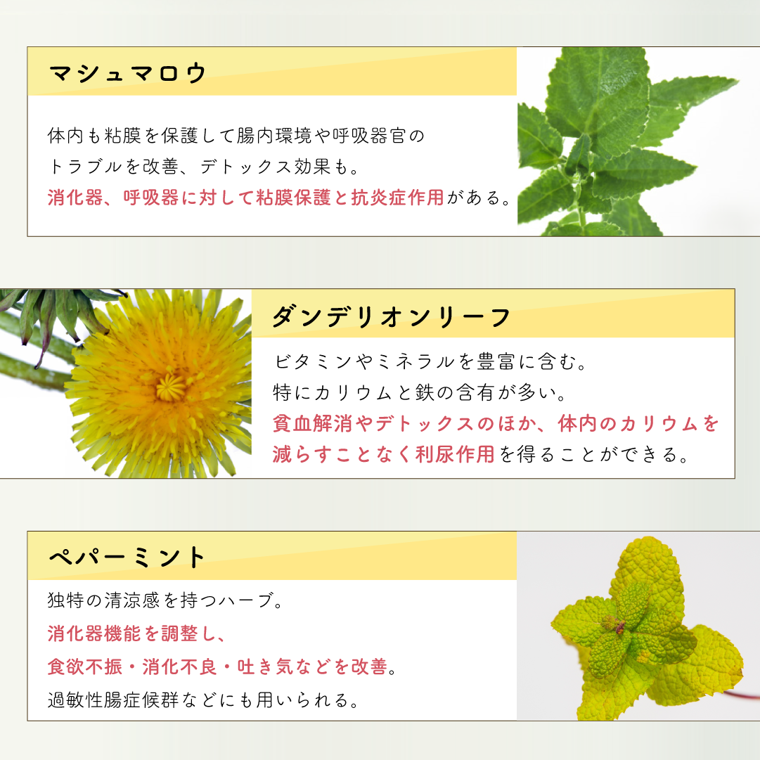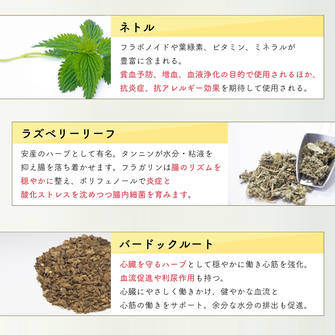 ブレンドハーブ 【マシュマロウ】※ 体内も粘膜を保護して腸内環境や呼吸器官のトラブルを改善、デトックス効果も。消化器、呼吸器に対して粘膜保護と抗炎症作用を活用する。 【ダンデリオンリーフ】※ ビタミンやミネラルを豊富に含む。特にカリウムと鉄の含有が多い。貧血解消やデトックスのほか、多くの利尿剤と違い体内のカリウムを減らすことなく利尿作用を得ることができる。 【ペパーミント】※ 独特の清涼感を持つハーブ。消化器機能を調整し、食欲不振・消化不良・吐き気などを改善。過敏性腸症候群などにも用いられる。 【ネトル】※ フラボノイドや葉緑素、ビタミン、ミネラルが豊富に含まれる。貧血予防、増血、血液浄化の目的で使用されるほか、抗炎症、抗アレルギー効果を期待して使用される。 【ラズベリーリーフ】※ 安産のハーブとして有名。含有のエラグ酸タンニンは鎮静、鎮痙攣作用で子宮や骨盤周囲の筋肉を調整する。含有成分のタンニン(没食子酸タンニン)は収斂作用を持ち下痢止めに使う。フラガリンは下腹部の筋肉を強くする。 【バードックルート】※ 日本では牛蒡としてそのまま食べるのが一般的です。食物繊維のイヌリンを豊富に含有するため腸内環境を調整。デトックス効果が高く皮膚の改善にも用いる。 内容量:20g(小型犬で約40日分)※はオーガニック認証ハーブ |