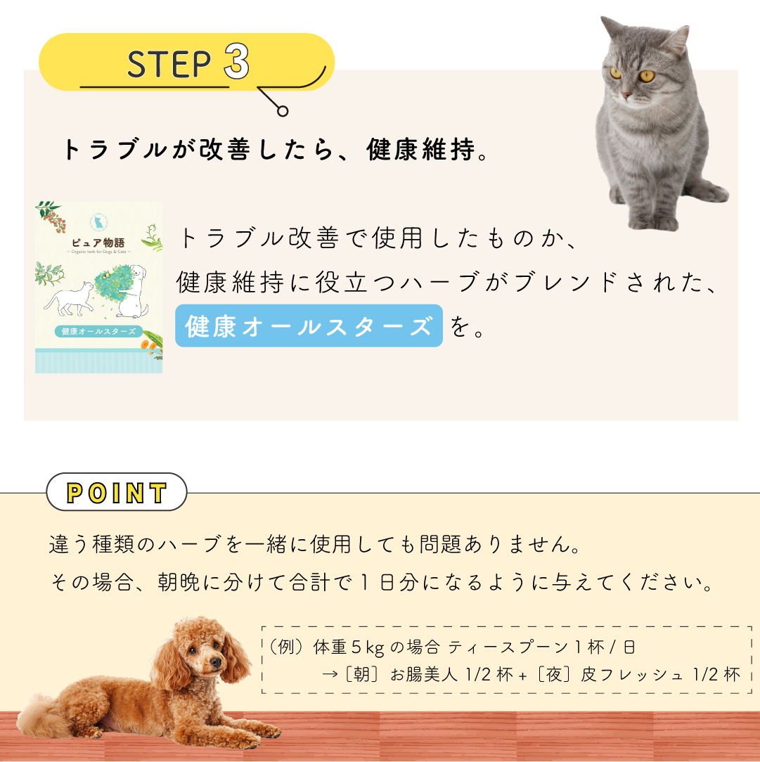 人間の食品用ハーブを使用しています。大切な家族には人間と同じ品質の物を与えたいという私達の想いを込めたブレンドです。